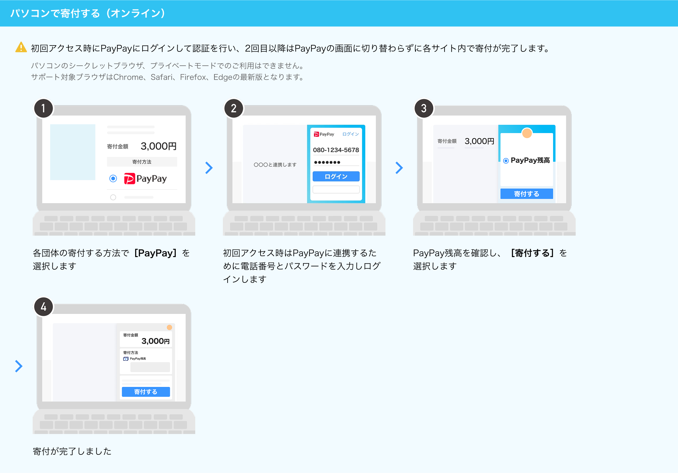 PayPayでのご寄付は、PayPay残高(PayPayマネー)、PayPayクレジットのみ利用可能です。