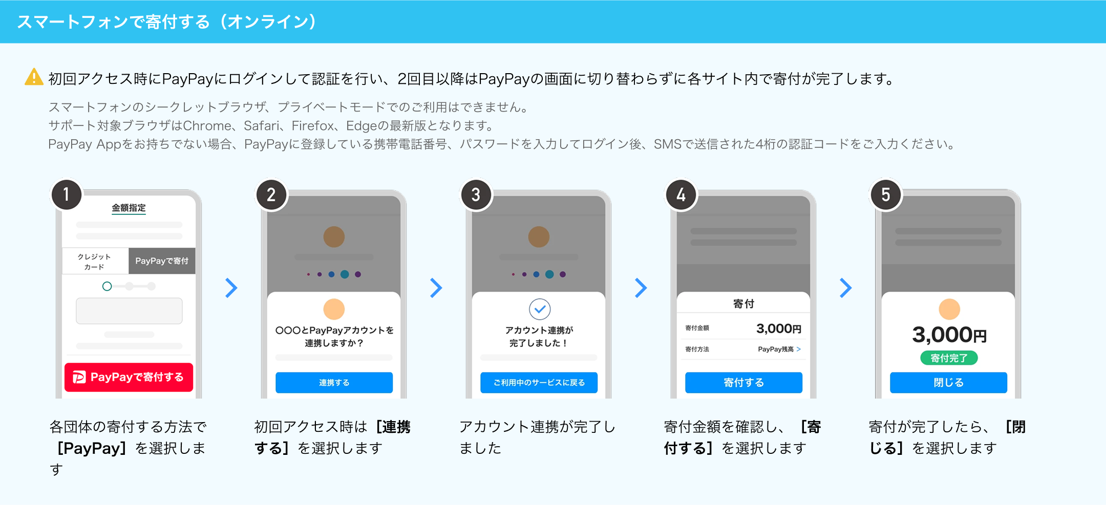 寄付金額に対してのPayPayポイントの付与およびPayPayステップは対象外となります。