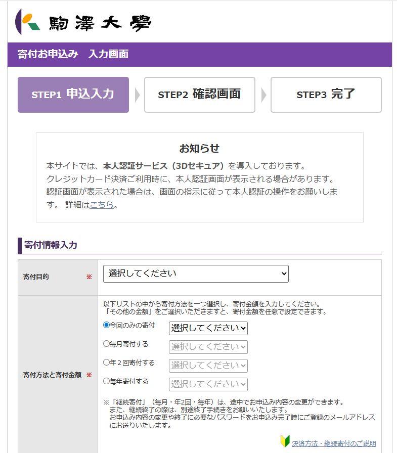 ①駒澤大学寄付サイトより、寄付申し込みフォームを入力してください