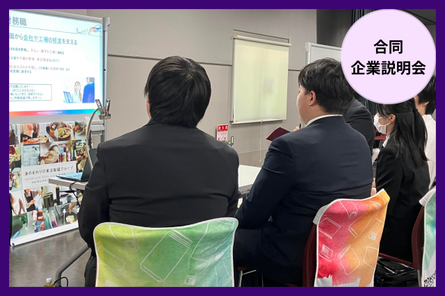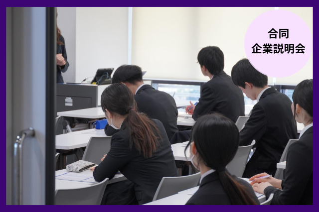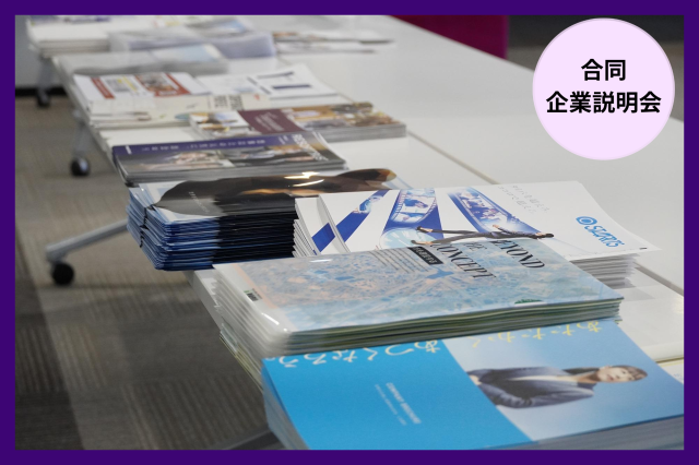 学内で開催される3年生対象の合同企業説明会です。様々な業界から参加企業等を誘致し、年間約250社以上の企業等に参加いただいています。企業等の人事担当者と近い距離で直接お話を聞くことで、仕事内容や働き方の理解が深められます。例年、3年生の2月からスタートし、年間を通して複数回に亘り実施されます。合同企業説明会で初めて知った企業に就職する学生もいます。