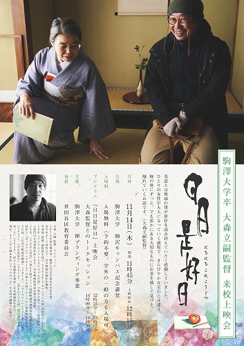 駒澤大学「禅ブランディング事業」の一環として、11月14日(木)に「『日日是好日』映画上映会&大森立嗣監督来校イベント」を下記の通り開催いたします。