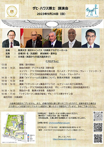 9月24日(日)、駒澤大学深沢120周年記念アカデミーホールにおきまして、元エジプト考古大臣のザヒ・ハワス博士の来日記念講演を開催します。