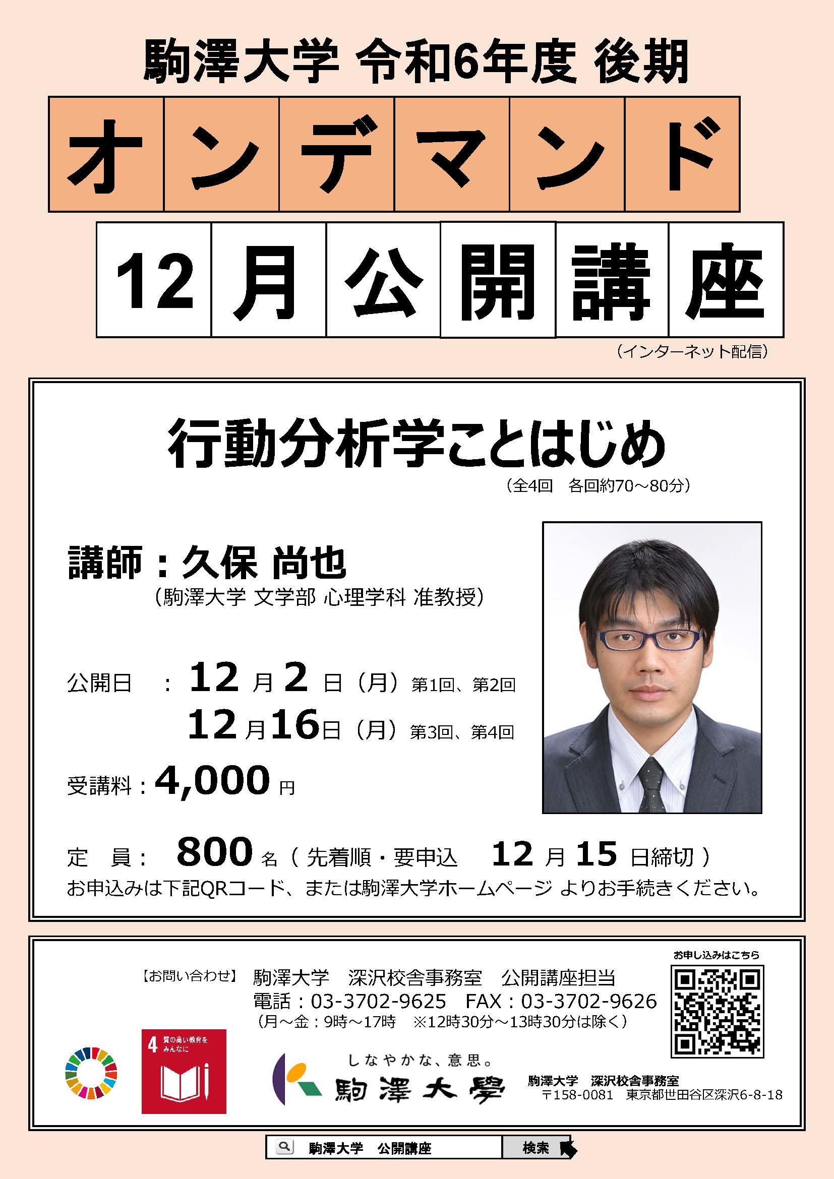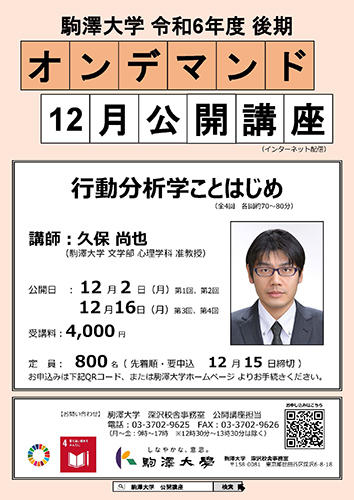 現在、2024(令和6)年度後期公開講座【12月オンデマンド講座】「行動分析学ことはじめ」の申込を受付中です。
