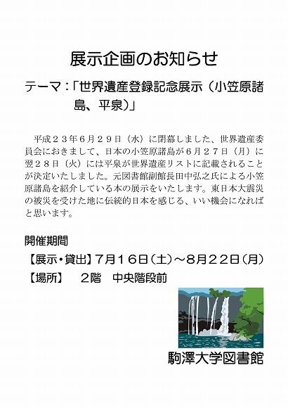 世界遺産委員会におきまして、日本の小笠原諸島、平泉が世界遺産リストに記載されることになったことに伴い図書を紹介いたしました。