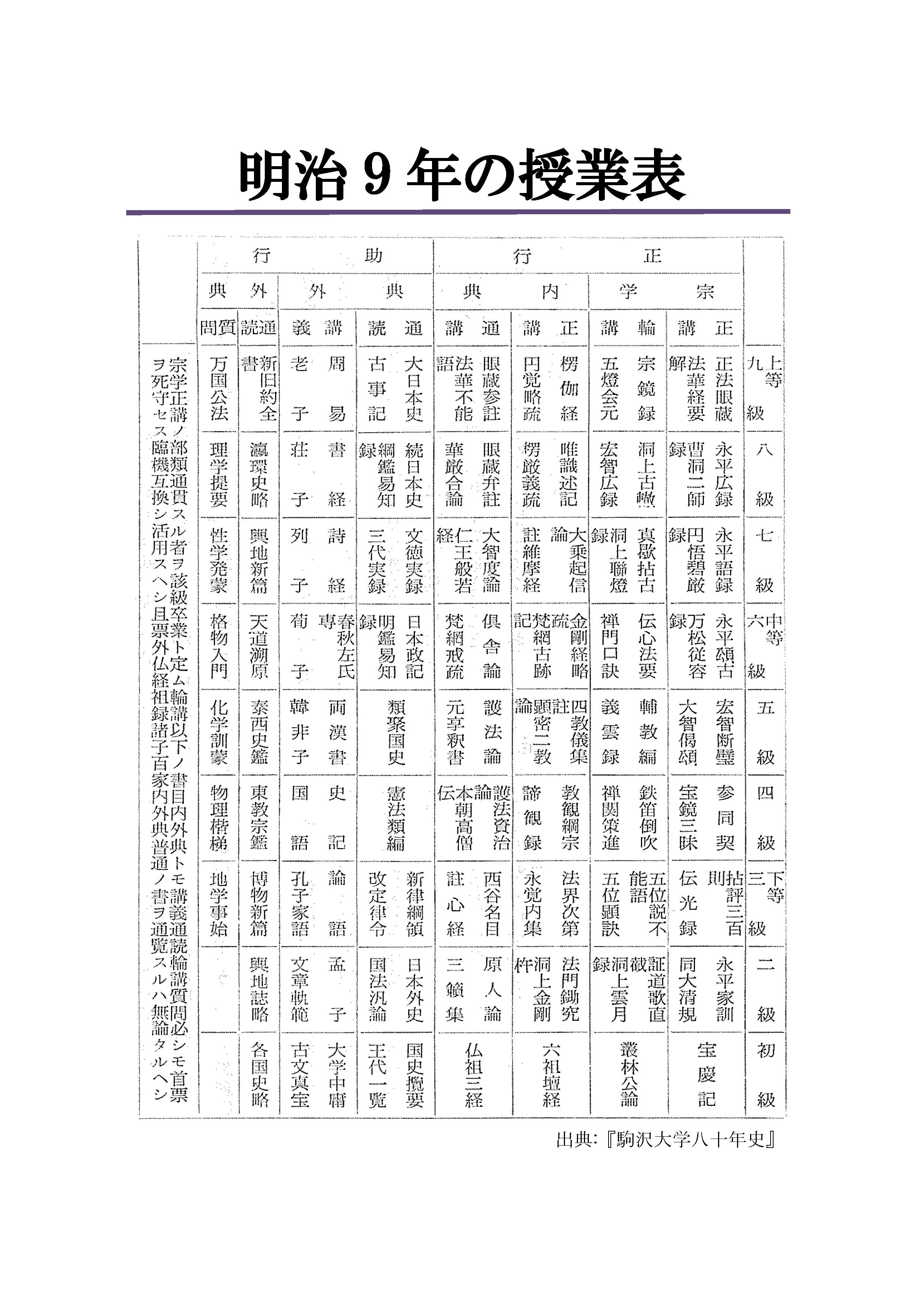 曹洞宗立の僧侶教育機関として開校した本学では、開校当初の授業科目の多くは仏教・禅に関するものでした。明治9(1876)年の時間割を見ると、仏教書・禅籍がそのまま科目名となっていました。