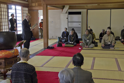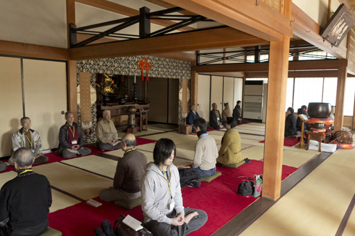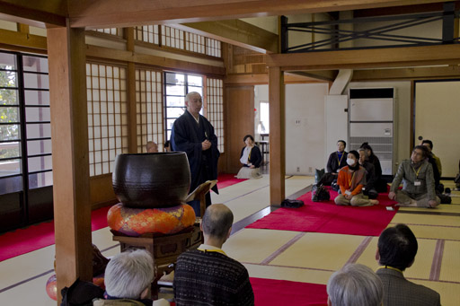 今回は、当館館長で本学仏教学部教授の永井 政之先生にご引率いただきました。まずご住職の平井 正修老師の法話を拝聴し、坐禅指導を受けました。また、境内や寺宝である鉄舟の遺墨・遺品や円朝の幽霊画などを拝観しました。