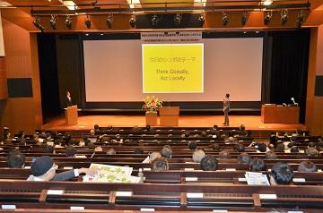 続きまして、現代応用経済学科長(学科主任)の長山宗広より、今回のシンポジウムのテーマ(Think Globally, Act Locally)や2018年4月に開設される「現代応用経済学科ラボラトリ(通称:地域協働研究拠点)」の説明がおこなわれました。