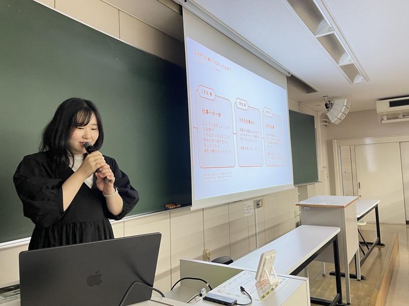 最初は、松本典子先生のゼミ卒業生である菅野葉菜さんが登壇されました。菅野さんは民間企業にデザイナーとして勤務される傍らで、フローリスト、フォトグラファーとしても活躍されています。