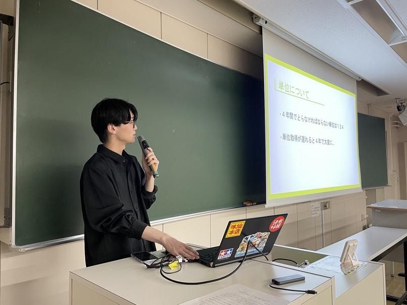 田村さんからは「大学生活を失敗しないためのコツ」を教えて頂きました。特に単位習得と卒業要件の充足に関わる情報は大変有益でした。趣味のラーメン店巡りや部活・サークルを精一杯楽しんでいる姿は素敵だと思いました。また、演習・ゼミナールの具体的な活動内容や先輩が考える「入るべき理由」を伺って、私も演習・ゼミを履修したいと思いました。