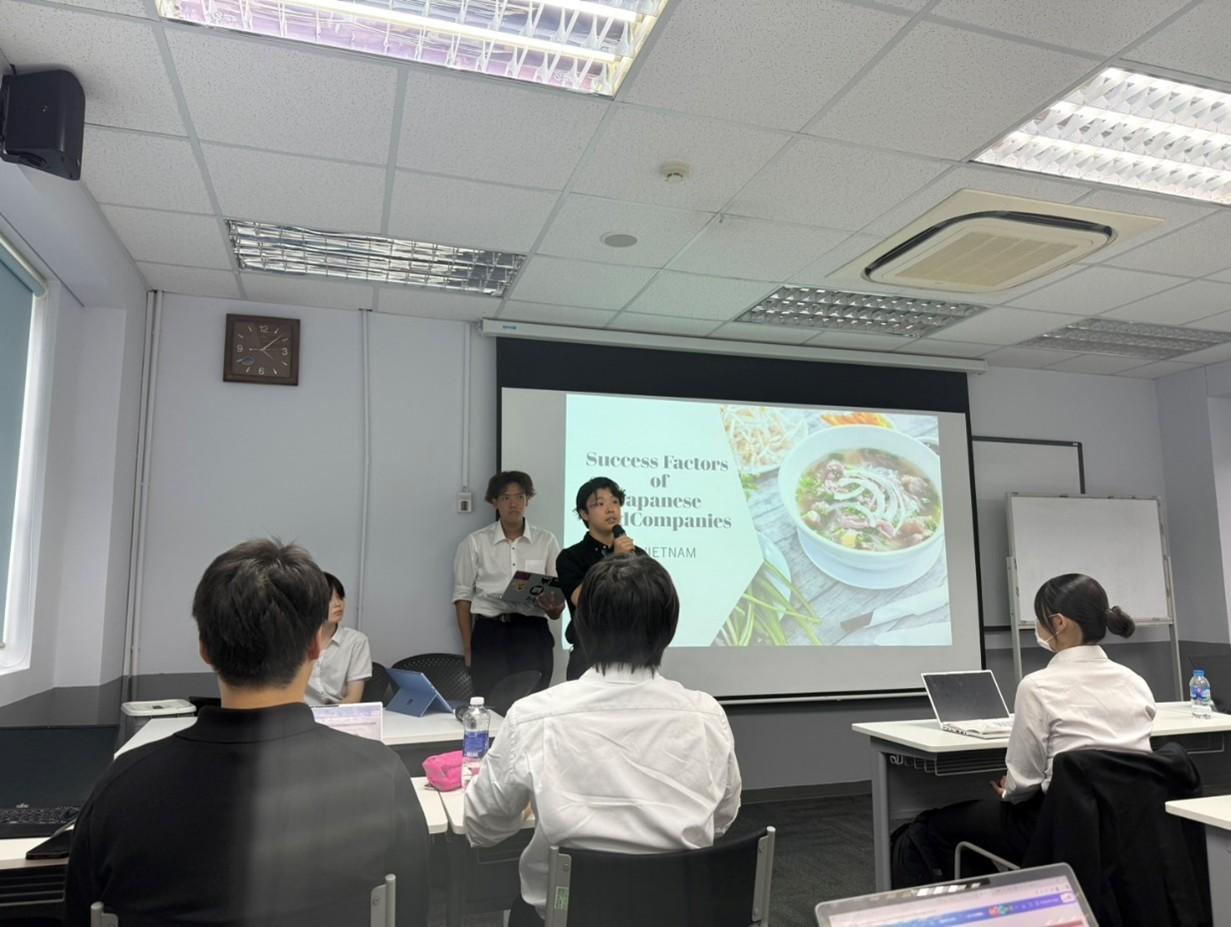 帰国前日の最終日にはベトナムにある日越大学での発表および交流会も行いました。調査してきた内容を英語で資料にまとめ発表することは苦戦をしましたが、新たな挑戦となりました。他者に伝える過程で、自分たちの理解が曖昧だった点や、論理の整理が不十分だった点が明らかになり、研究内容を見直す重要性を実感しました。現地のベトナムの学生とも意見交換や交流会を行い新たな視点に触れる有意義な機会となりました。