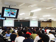 10月5日の「ベンチャー企業論」は、広告漫画から書籍のコミカライズ、さらに様々な漫画関連事業を幅広く展開している株式会社トレンド・プロ代表取締役の岡崎 充 氏をお招きしての講義でした。