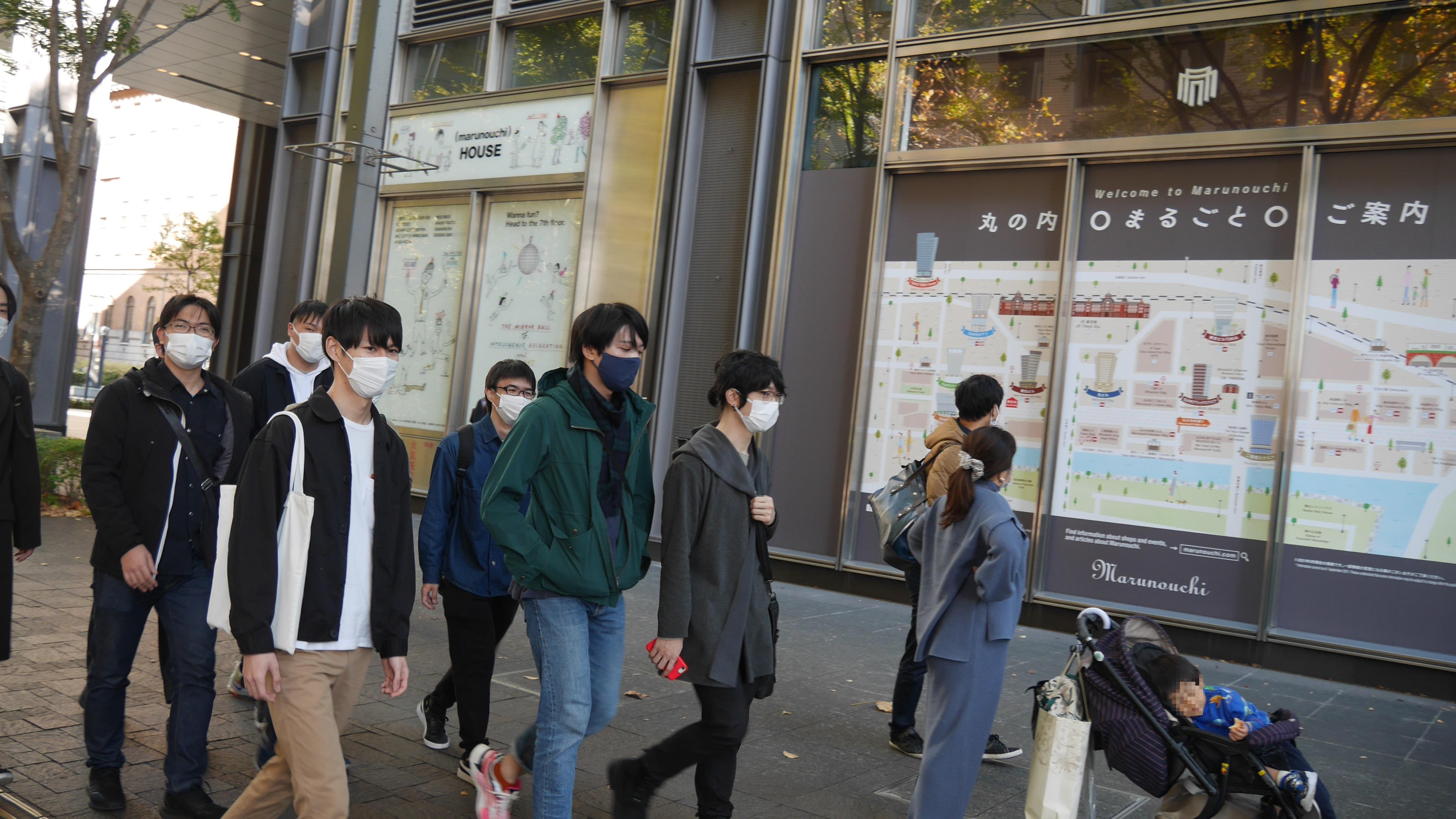 さて,丸の内のオフィス街を歩いていきます。みなさんは普段来ることはない街ですよね。就職活動の時に初めて来てまごつくことのないように,雰囲気に慣れておきましょう。