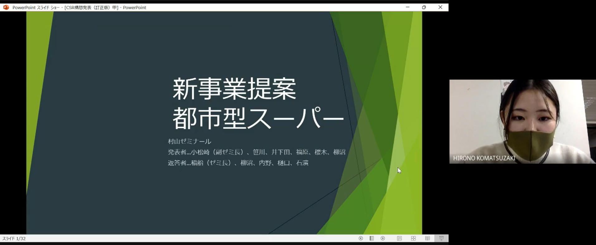 参加したのは経営学部・村山元理ゼミナール3年生(演習Ⅱ)の10名で、駒沢スーパーの実現可能性について既存のネットスーパーの研究から新規の事業タイプの出店を提案しました。最も質問が多く集まり、他大学の教員からも高く評価される内容でした。発表は事前に作成した動画で行われました。以下のその冒頭の一部を紹介します。