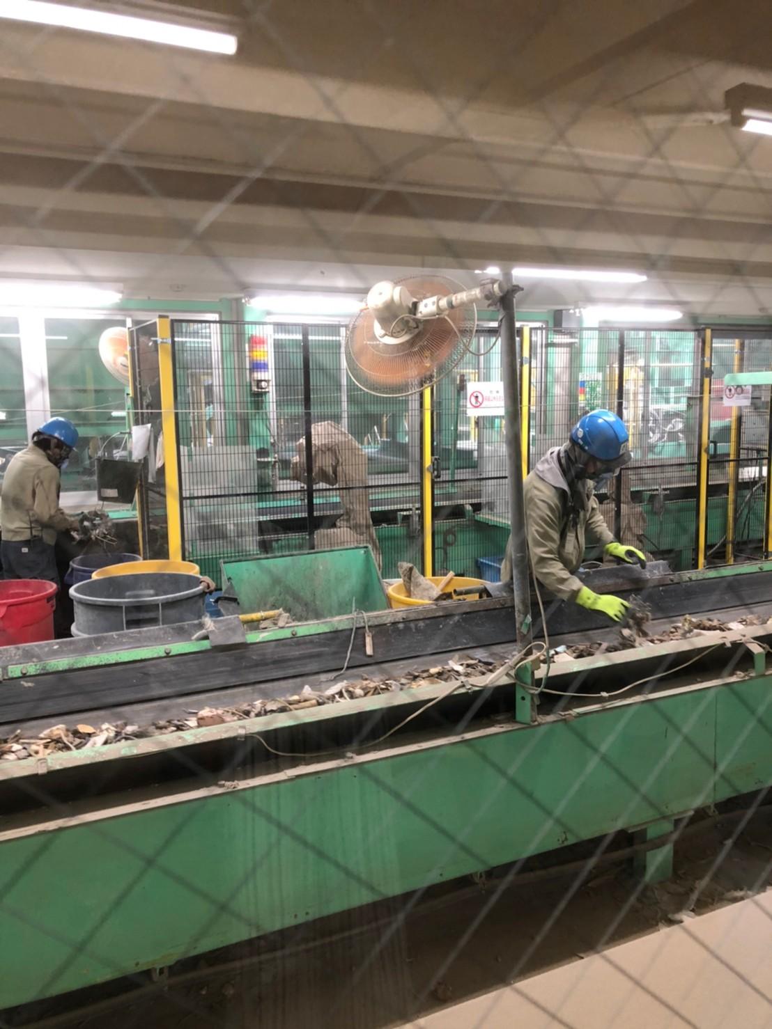 工場内部は手作業でゴミを人間が分別したり、人が機械を使いゴミを細かくしたり、AI の力を借りて分別していました。全て AI がやってるものだと思っていましたが、人が手作業でやってる姿に驚きました。AI と人とでは作業効率に差があり、1 秒間に分別できる量は人間の方がAI より 2.3 倍上だとの事でした。