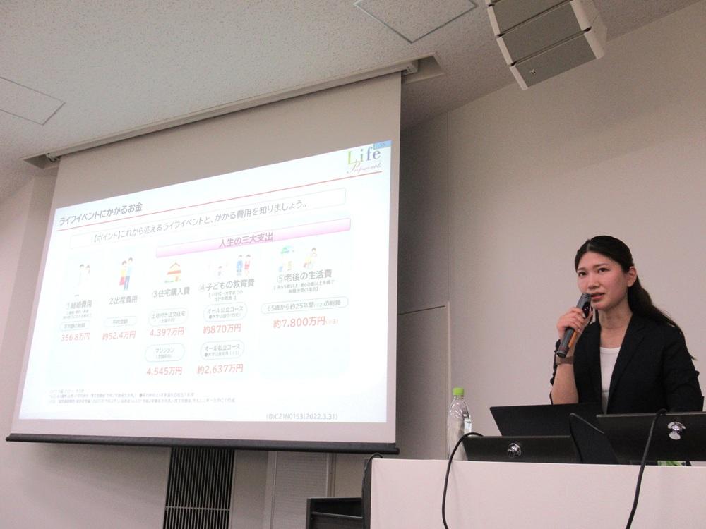 学生の多くが生命保険に直接関わる機会が少ない中、石川氏は「リスクへの備え」と「貯蓄と保険の違い」について、基礎から丁寧に解説。さらに、人生のライフステージごとに必要となるお金の目安や、その備え方についても紹介し、社会人になる前に知っておくべきお金の考え方を伝えました。