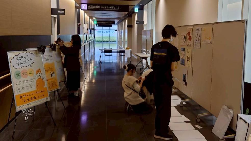 人生の最終段階について考えるのは、心のどこかで引っ掛かりを感じる方も多いと思います。学生たちは、少しでも抵抗を減らそうと、親しみやすい啓発ポスターのデザインで世田谷区にこの概念を広めようと活動しています。2023年から続くこのプロジェクトも3年目を迎えます。今回は新たな情報を盛り込んだ展示を行いました。