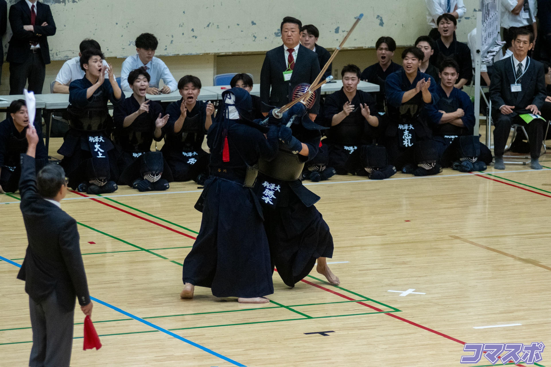 休憩を挟んで行われた5試合目の国士舘大戦。駒大は先鋒の田中、次鋒の松尾が面で二本勝ち。五将の間宮が面で一本勝ちと有利に進めるも、中堅の岩佐は試合開始早々面を山崎(国士舘大)に奪われてしまう。その後に突きでさらに一本を取られるも次の三将一番ヶ瀬が面で一本勝ち。駒大は5連勝を果たした。