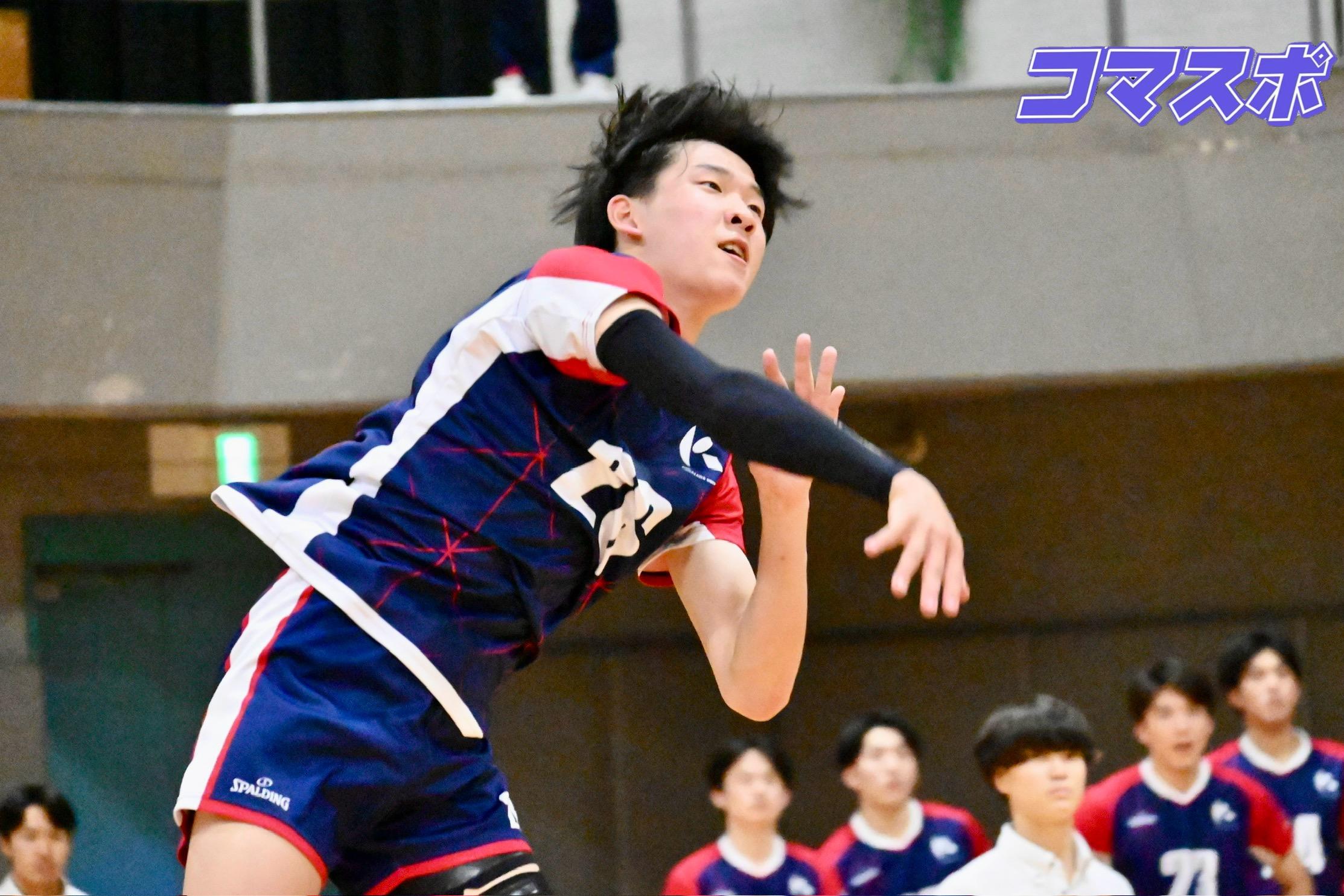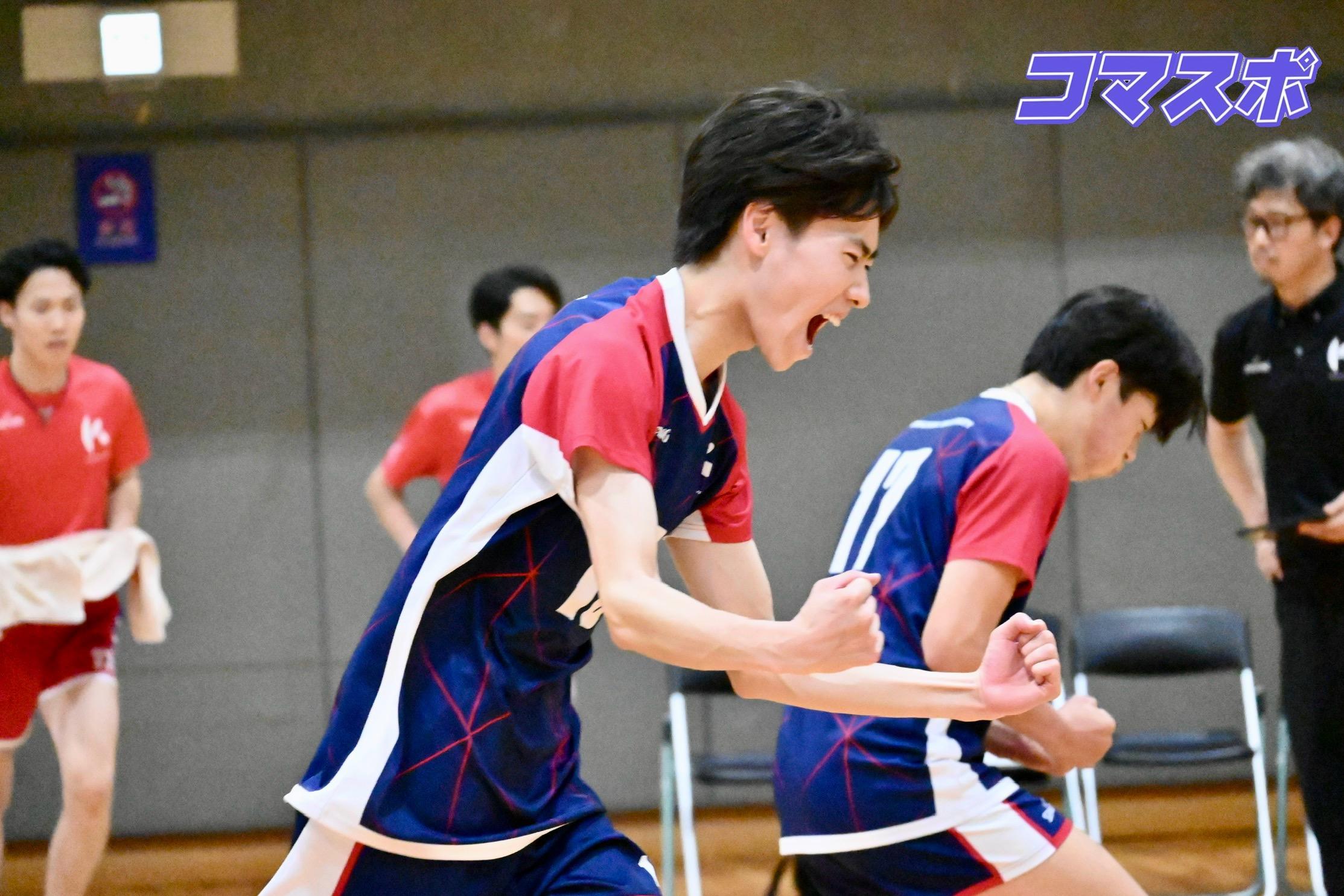 第1セットは序盤から互いに点を取り合う展開となる。同点のまま試合は中盤にもつれこみ、尾﨑太洋(経2)のツーアタックにより13-12の場面、菅原秀斗(歴1)と尾﨑がそれぞれブロックを決め2連続得点。一気に点差を広げる。その後もブロックポイントと積極的な攻撃でリードを守り、先に20点台へ突入。小林拓磨(営2)のブロックで点を取り迎えた駒大のマッチポイント。菅原の2枚ブロックを無視したクロスのスパイクが決まり25-23で1セット目を先取した。