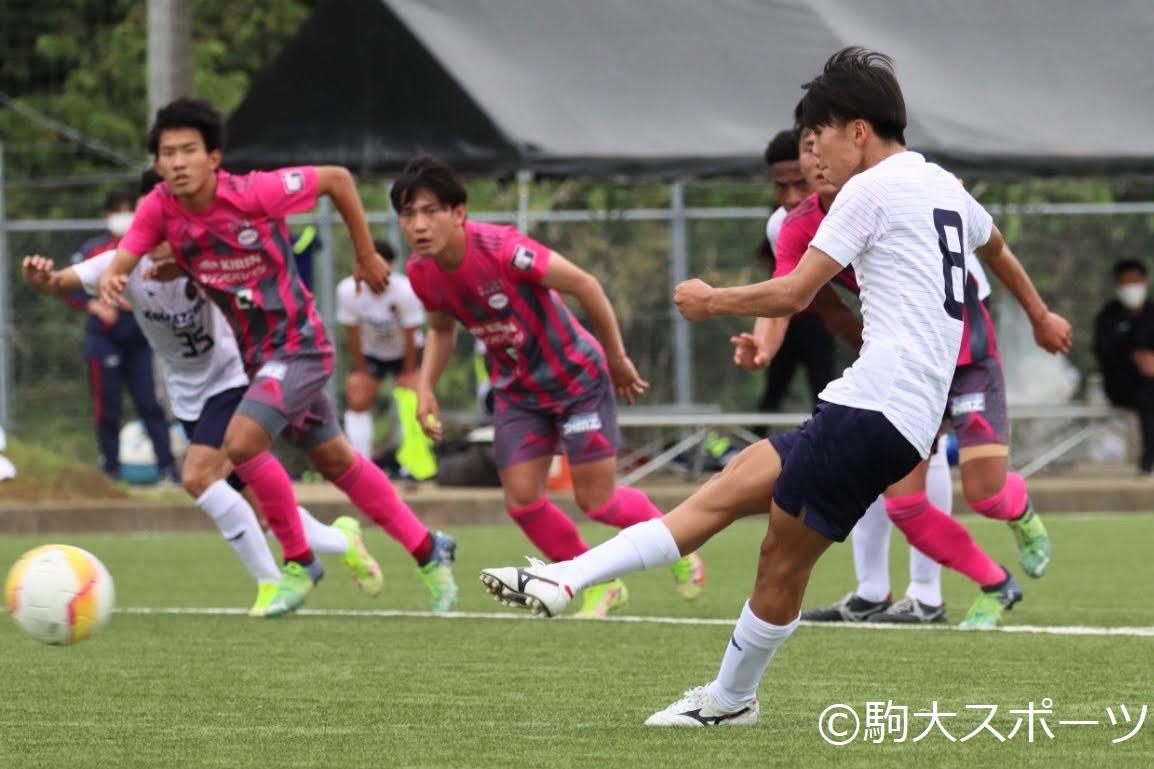 前半は終始駒大ペース。19分、GKの動きを見て須田がハーフウェイライン付近からの超ロングシュート。これがゴールネットに突き刺さり先制。29分、34分には敵陣深くのインターセプトからウォーが1対1の状況を作るもそれぞれ枠外、GKのセーブでゴールとはならず。37分には小島のスルーパスに反応したウォーが三たびシュートチャンスを迎えるも、これもGKのセーブに遭い三度目の正直とはならず。前半を1-0で終えた。