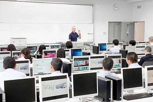 まずは駒澤大学やグローバル・メディア・スタディーズ学部に関する質問を英語で対話することからスタートし、その後は『新しい言葉が言語にどのように入ってくるか』というテーマに基づいて英語で講義が行われました。