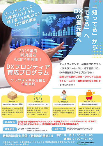 データサイエンス・AI教育プログラム(リテラシーレベル)修了者を対象とした実践的なDXスキル習得プログラム「DXフロンティア育成プログラム」を設けました。