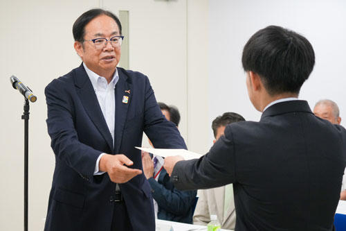 令和7年度は、同窓会奨学金奨学生として37人が採用され、出席者32名に対し、大石 孝 同窓会長から「奨学生決定通知書」が授与されました。