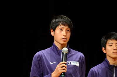 選手入場後、廣瀬 良弘 学長が挨拶し、陸上競技部からは 田中 徳定 部長、大八木 弘明 監督の挨拶に加えて、西山 雄介 選手(経済学部4年)をはじめとする8人の選手が箱根路への意気込みを語りました。