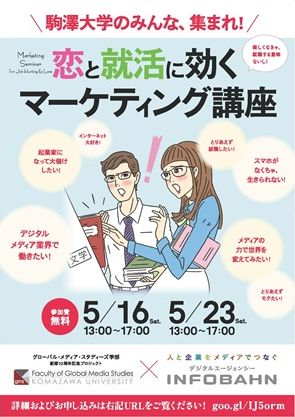 第1弾となる今回は、5月16日(土)と23日(土)に株式会社インフォバーンと共同で、メディア業界への就職を希望する学生を対象に「恋と就活に効くマーケティング講座」と題し、メディア業界の仕事を体験できる講座とワークショップを開催します。